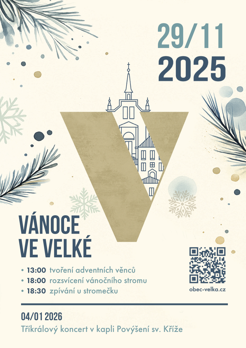 dovolujeme si Vás pozvat na slavnostní rozsvícení vánočního stromečku ve Velké, které se uskuteční v sobotu 29. listopadu 2025.
